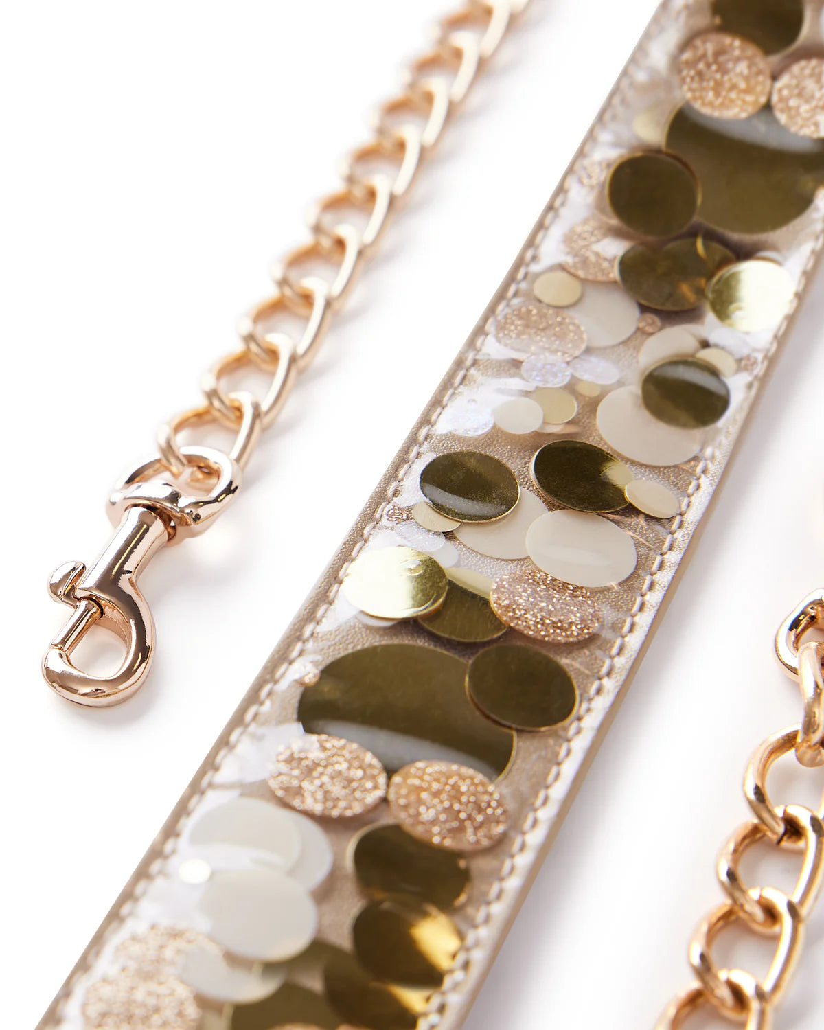 Customize your clear belt bag with this removable confetti strap attachment! Designed to fit our Cooper Crossbody and Clear Belt Bag, this strap is the perfect finishing touch for your gameday look. Featuring an adjustable gold chain and a variety of different confetti color options, this luxe strap will have you repping your team in style.