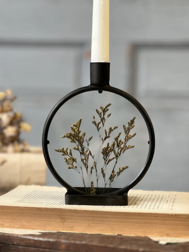 Small pressed flowers add a nostalgic air and make a unique addition as they double as a beautiful taper holder. Available in three styles, each sold separately.