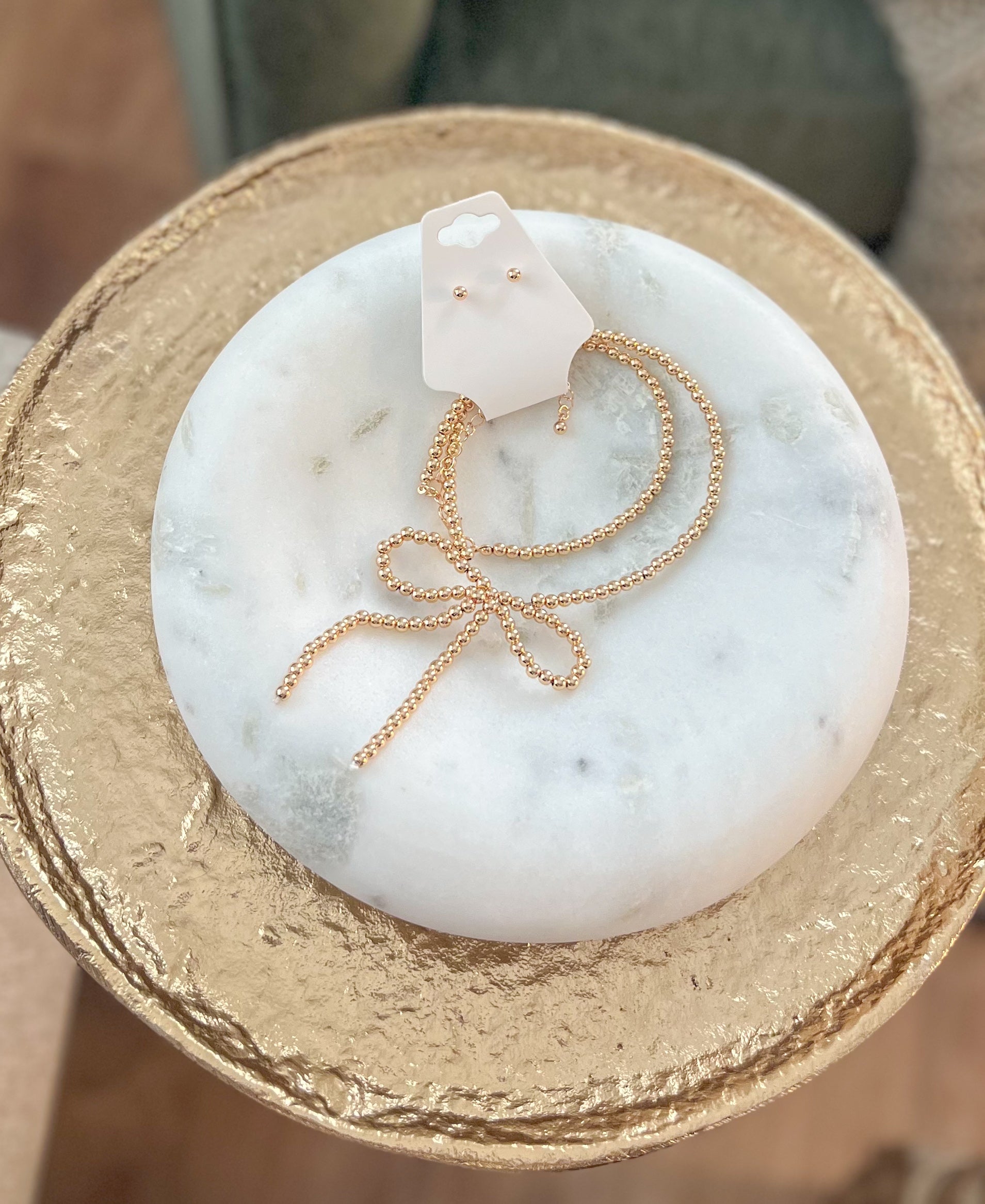 18" adjustable beaded gold bow necklace paired with gold bead studs.