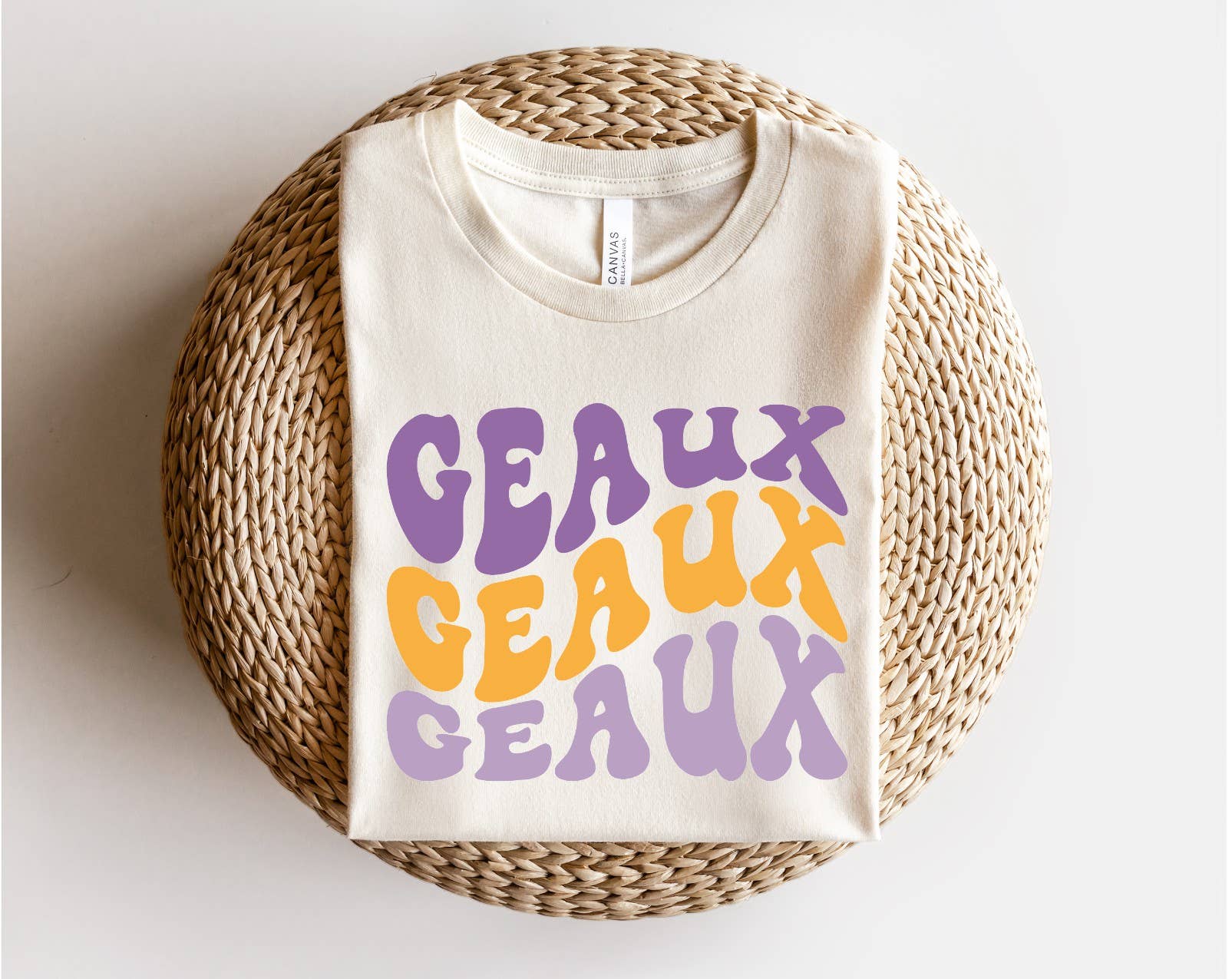 Purple and Gold "Geaux Geaux Geaux" design printed on cream Bella Canvas unisex triblend tee.