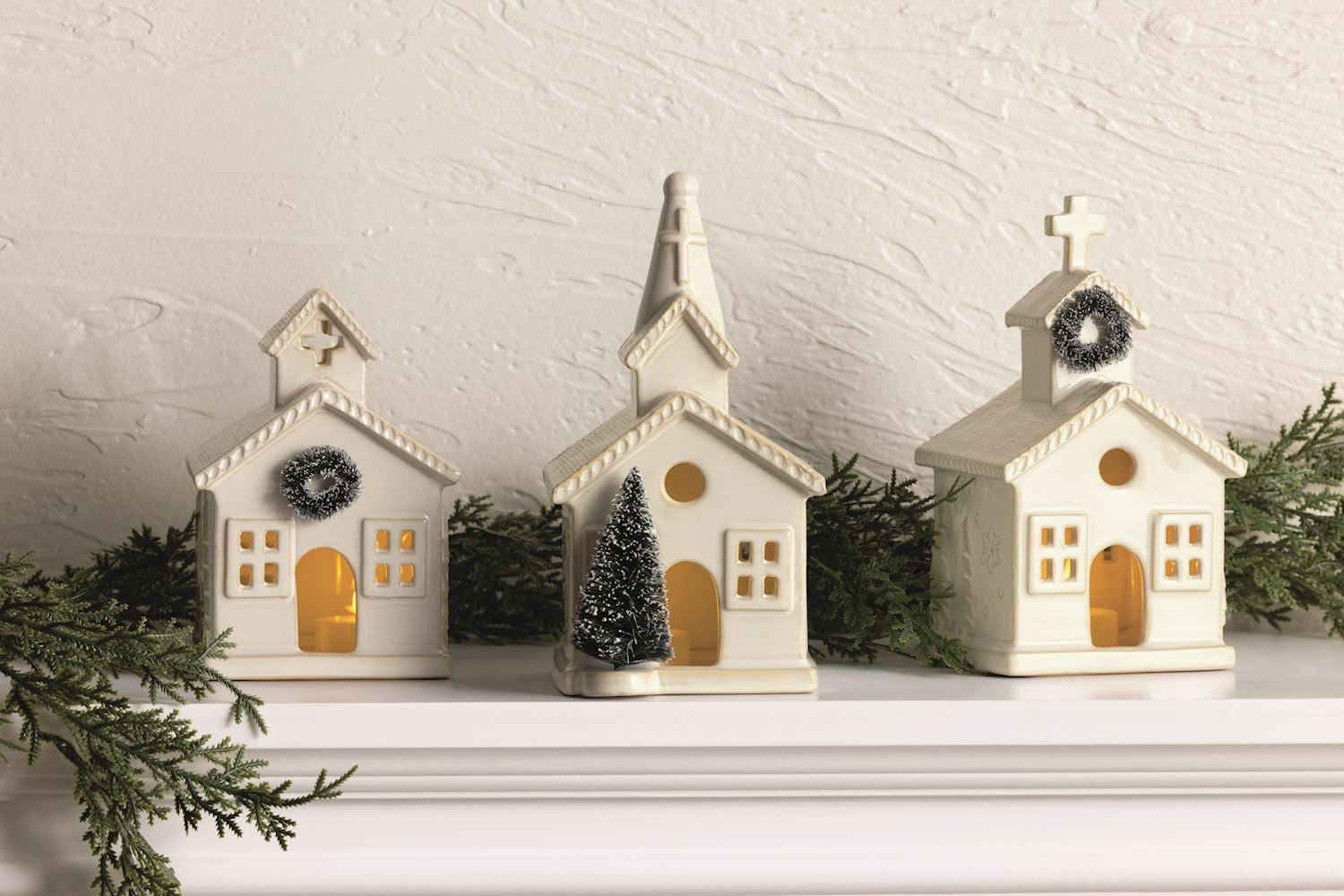 Milk glazed stoneware church sitter features bottle brush wreath or tree detail and pierced openings for light to shine through. Place over flameless tea light to light it up!