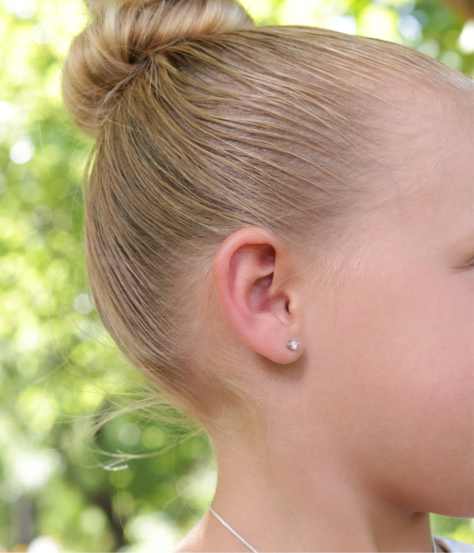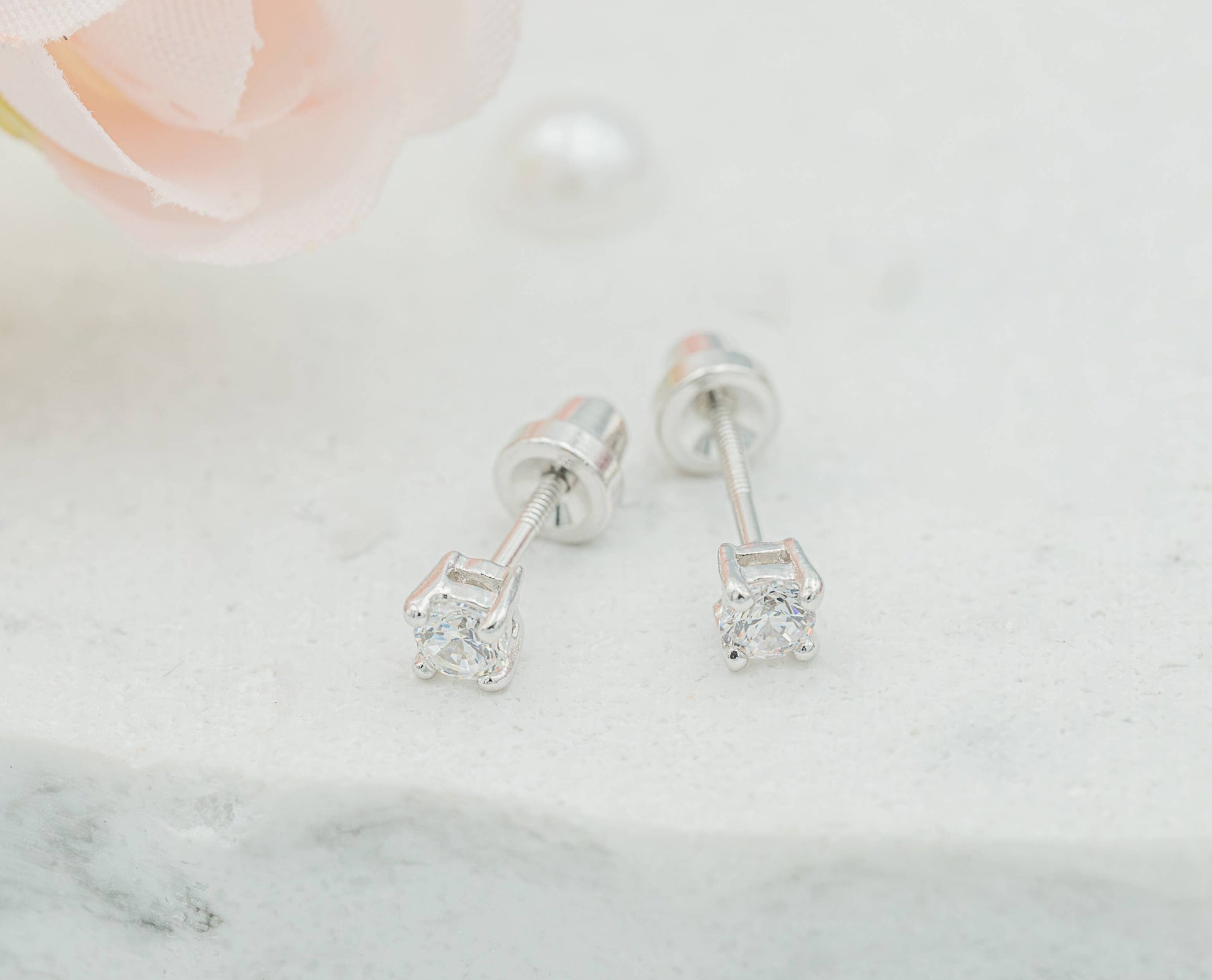 Sterling silver dainty clear CZ stud earrings for little girls (3mm). These sweet little earrings come with screw backs so she won't lose them. Earrings include an extra hypo-allergenic, anti-tarnish finish to keep your pieces sparkling beautifully for years and come in darling black velvet heart gift box!
