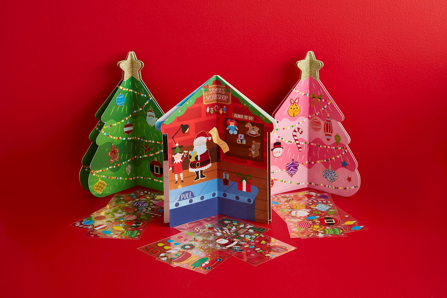 Decorate dimensional folding Christmas tree or gingerbread house booklet with included stickers.
