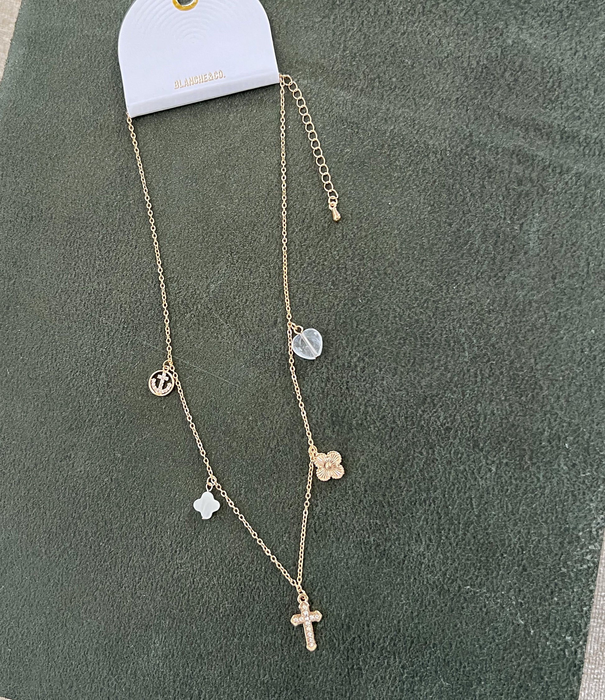 cross, clover, anchor, heart charms on gold necklace - adjustable