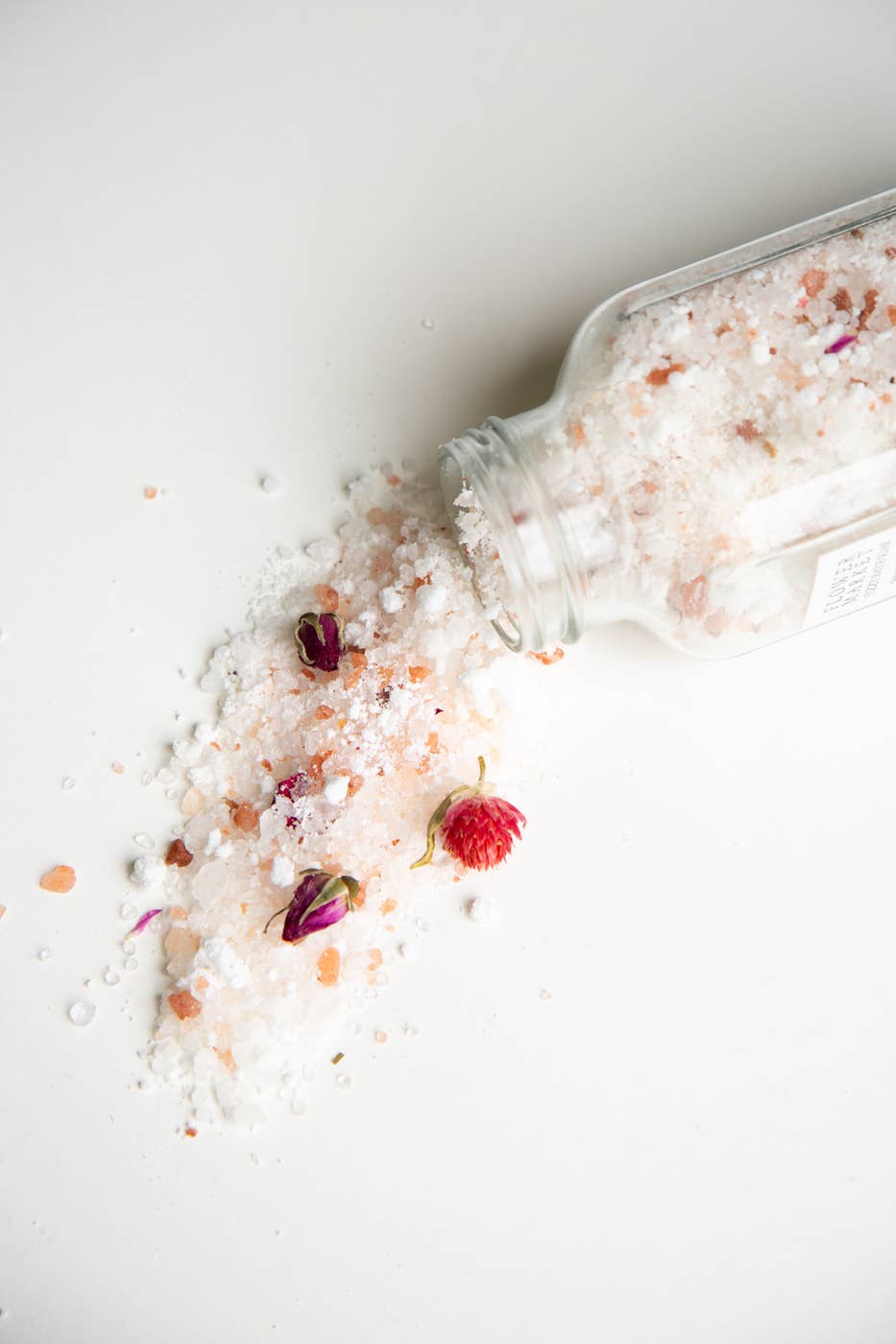 Indulge yourself in a pampering spa treatment in the comfort of your home. Relax sore muscles, drain stress, and nourish your senses with a bouquet of florals and fizzing bath salts. Our Sea Salts, Pink Himalayan Salts and fizz are infused with lavender essential oil and fragrance oil and hand mixed in small batches with dried lavender buds, rose petals, and a bouquet of dried flower petals.