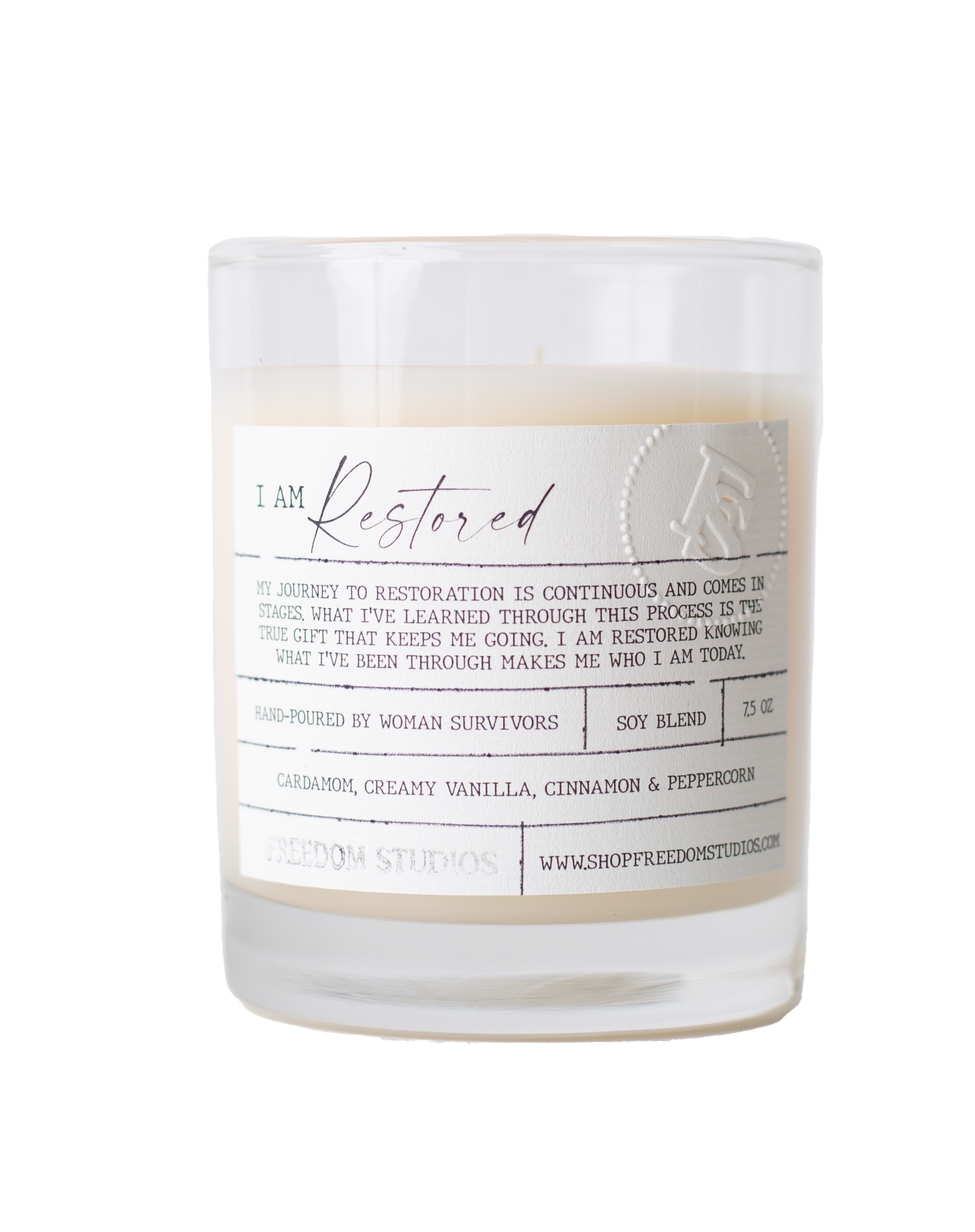 This 7.5 oz glass candle is made with soy blend wax and clean-burning cotton wicks and is hand-poured by women survivors.