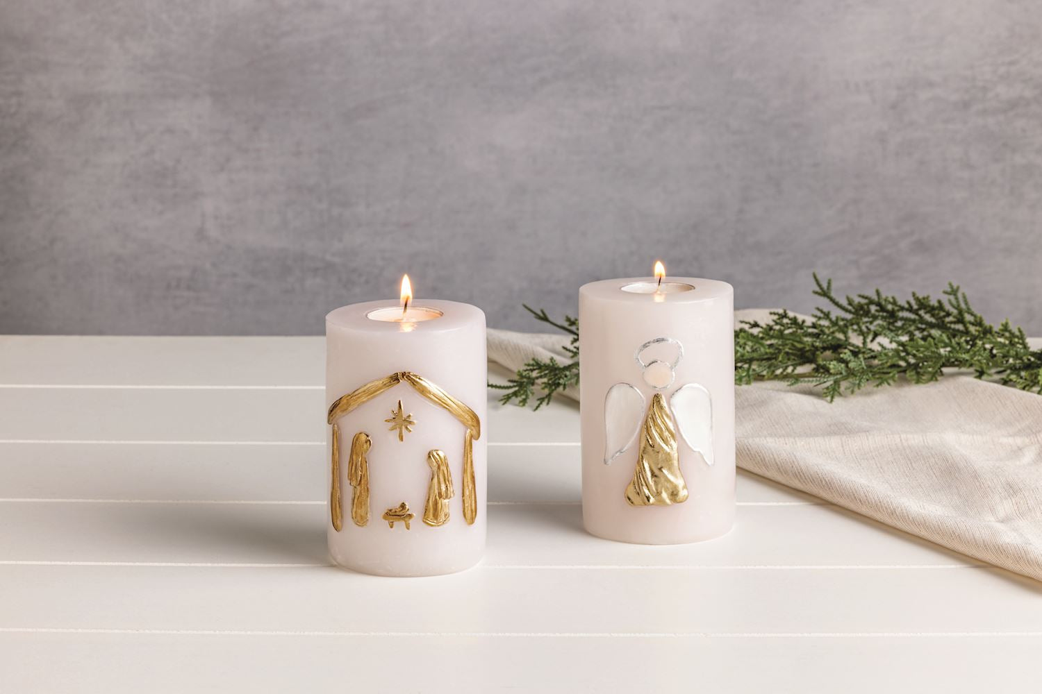 Hand-painted resin pillar holds standard tea light. Place and replace for limitless houses of candle enjoyment. 2-piece set