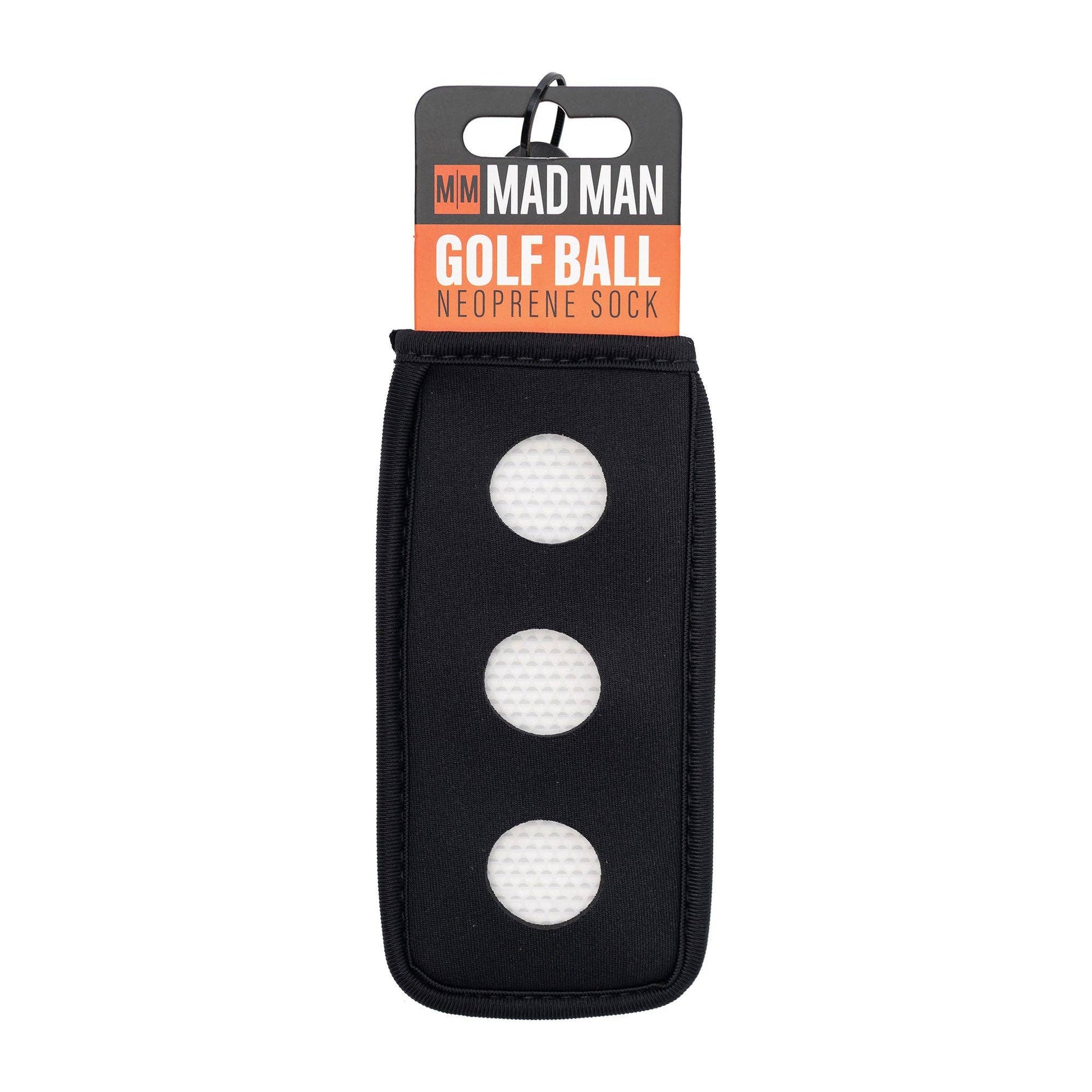 The Mad Man Golf Ball Neoprene Sock carry bag is made of soft neoprene cloth, which is light, flexible, and reusable. Includes 3 golf balls and clips to any bag.