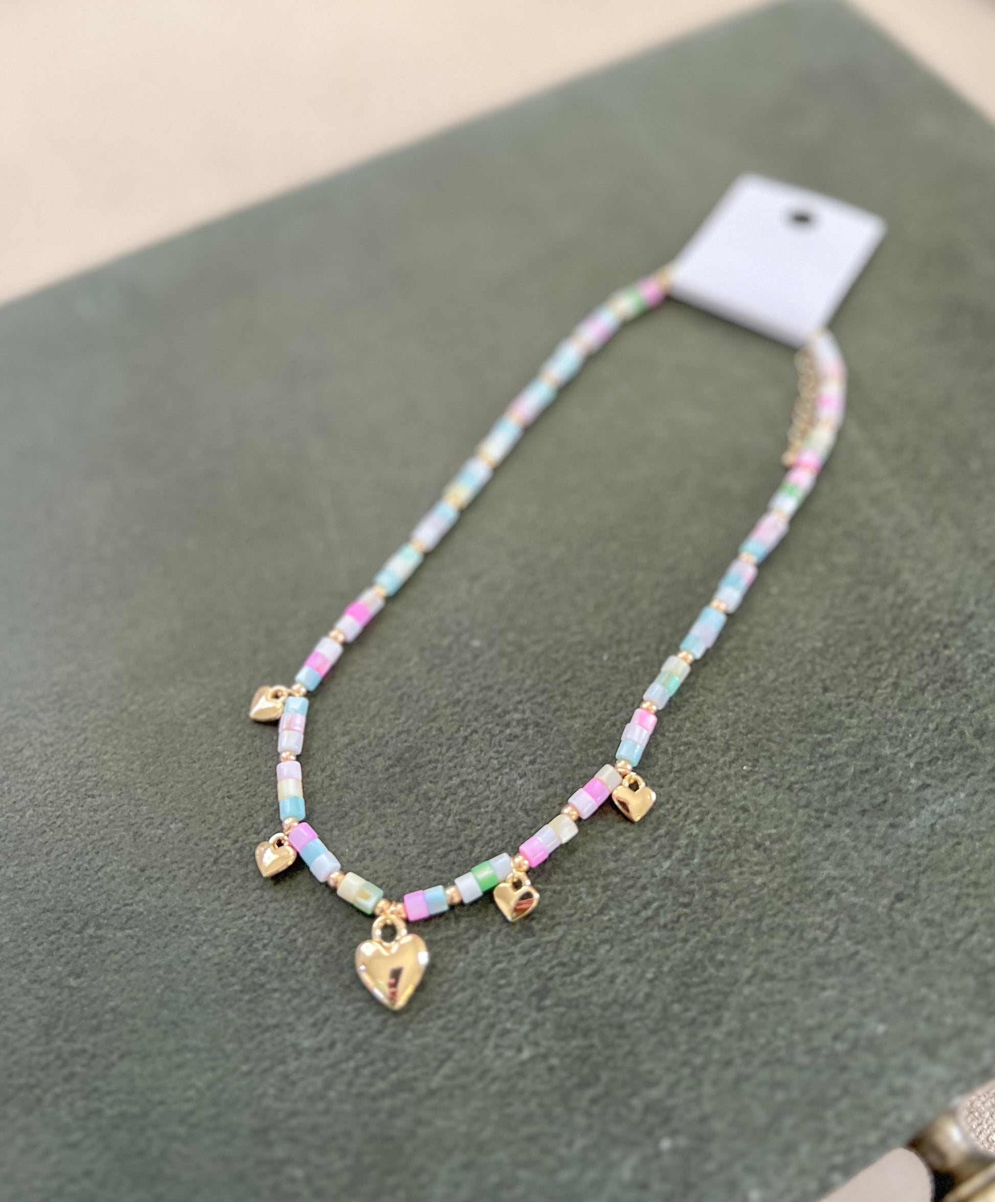 5 heart charms on a multi-colored shell bead necklace - adjustable
