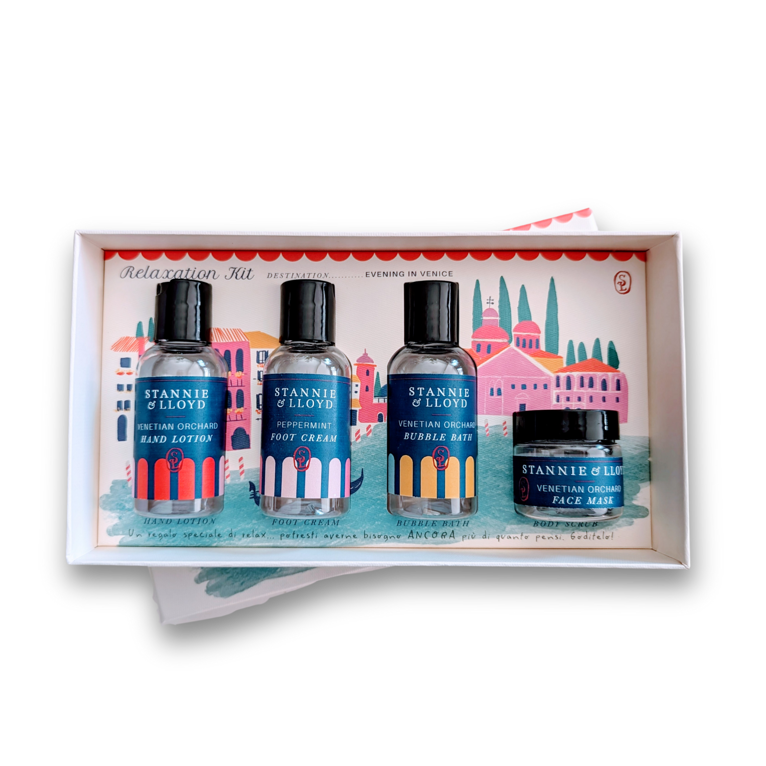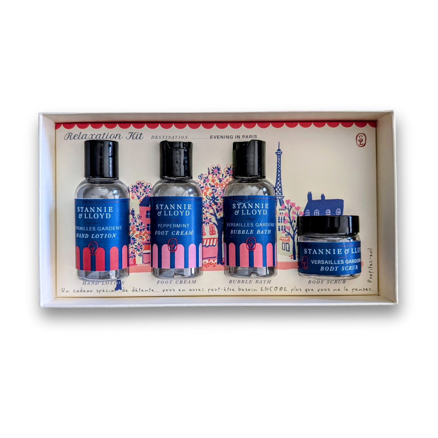 each kit includes: hand lotion - foot cream - bubble bath - body scrub
