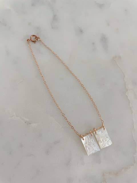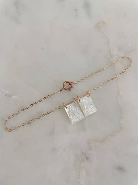 Beautiful authentic Mother of Pearl scapular bracelet. Each pearl is 8x11mm. The scapular is on 14k rose gold filled chain with 14k rose gold filled clasp/jumprings. Bracelet measures 7", but any length can be made.