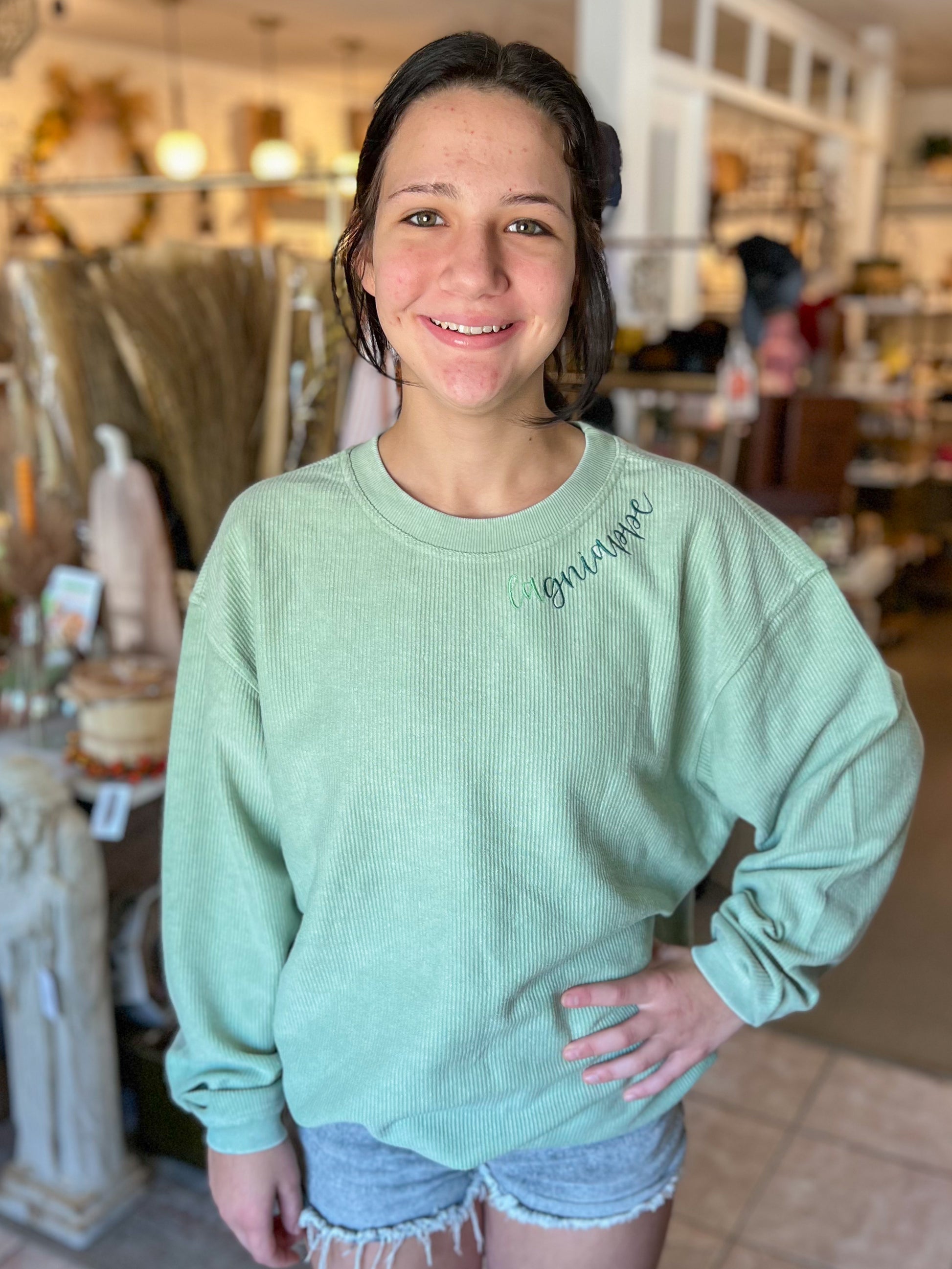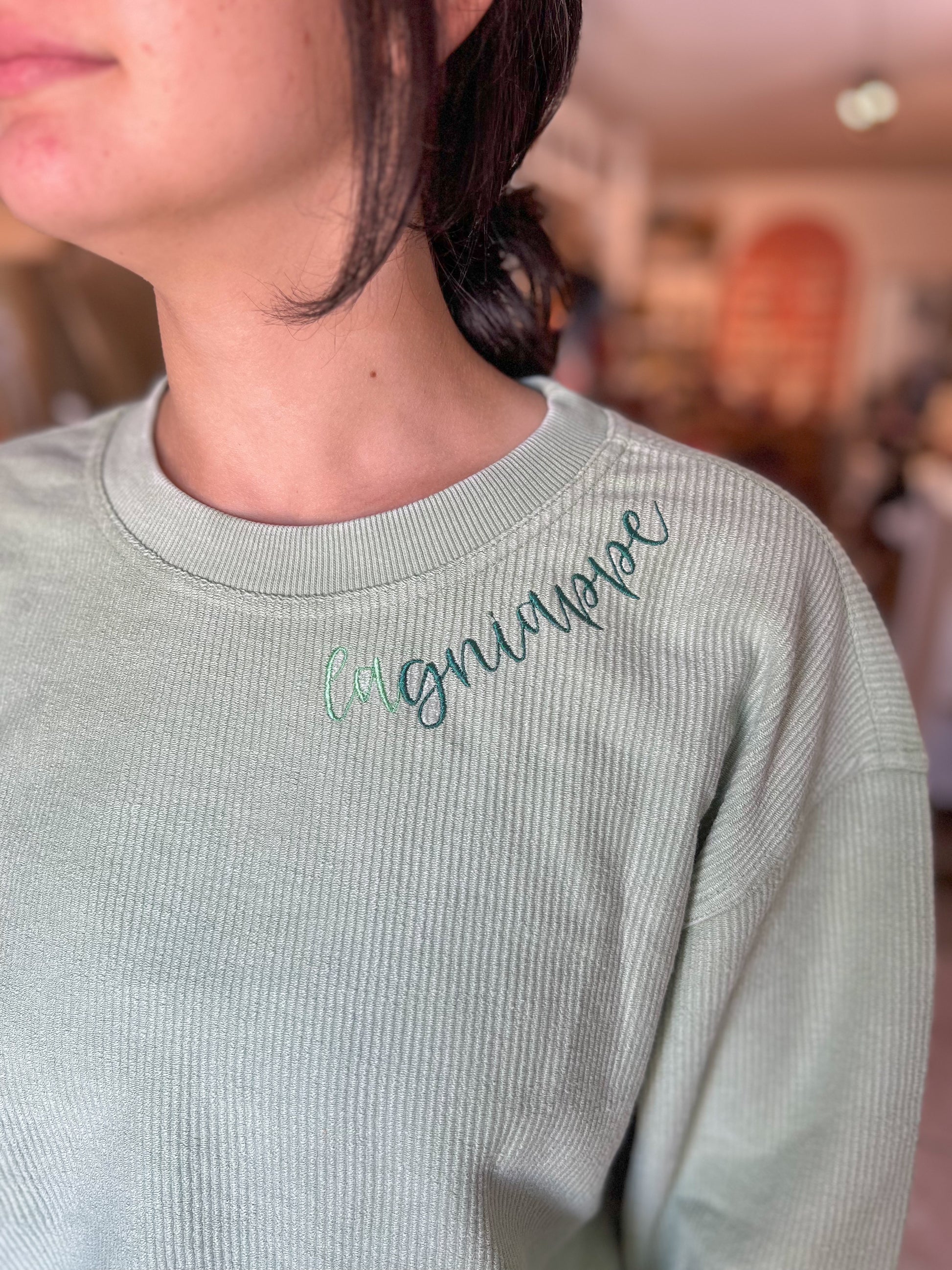 Monogrammed Lagniappe around neck of sweatshirt. "La" is monogramed in lighter color to symbolize Louisiana.