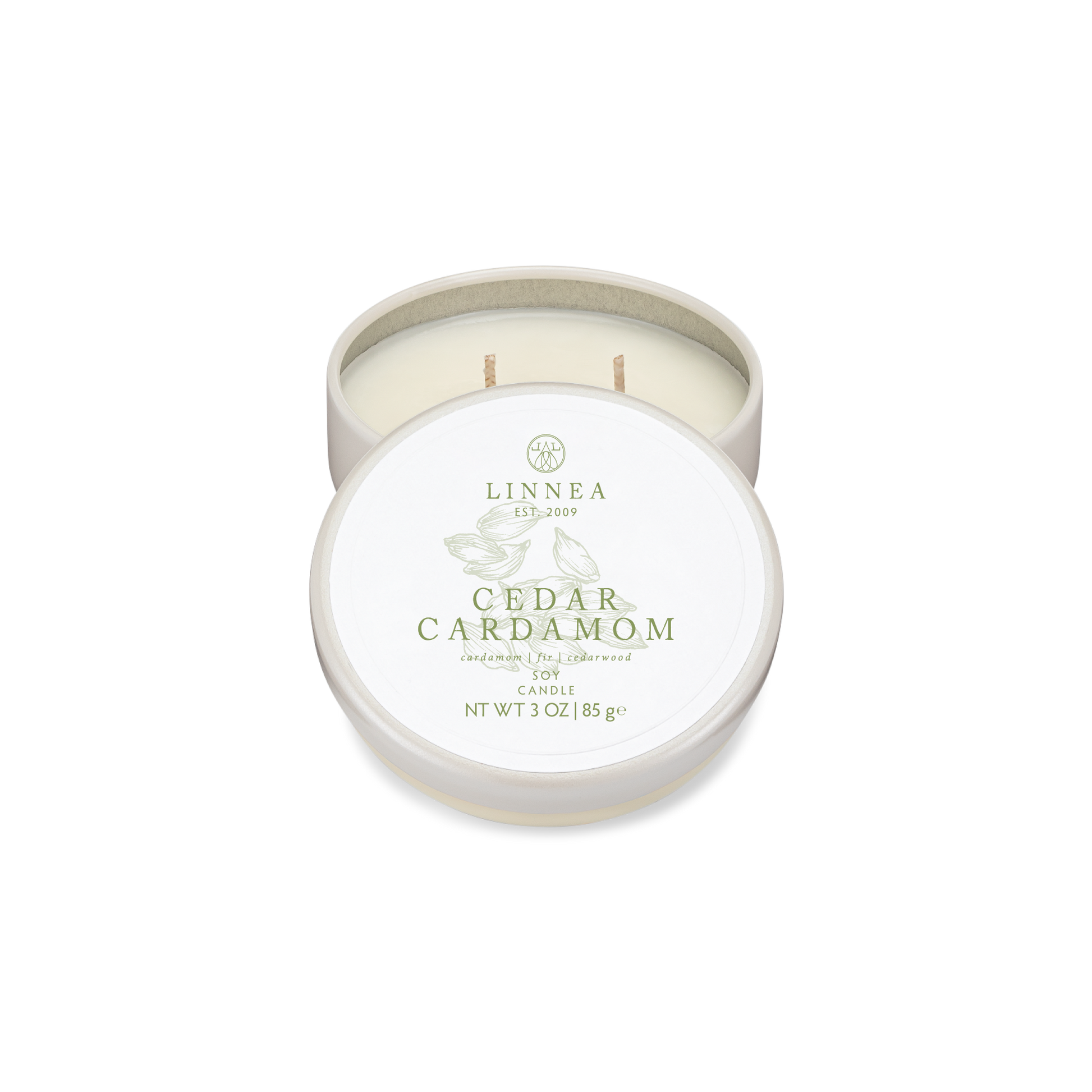 double cotton wick | pearlized lidded tin | 3.375”D x 1.625”H