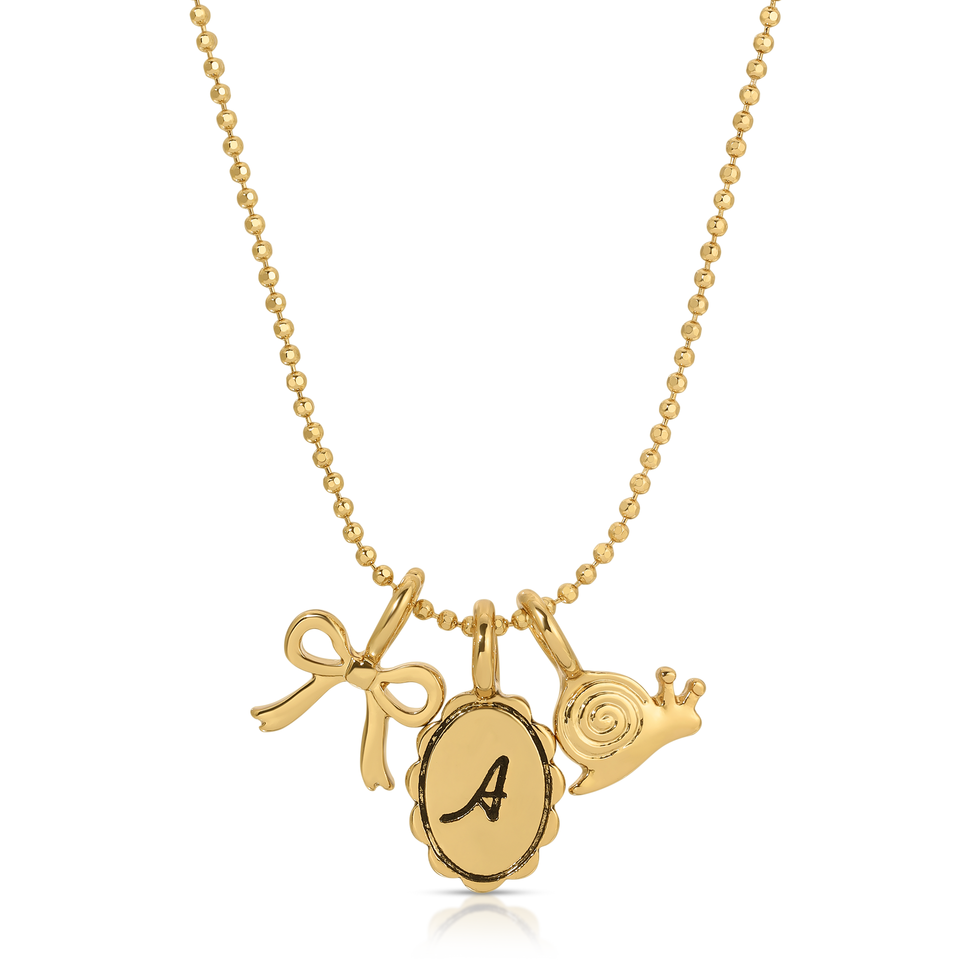 A fresh take on our original Charm Builder Collection! The Charm Garden features miniature vintage-inspired shape and initial charms that can be added to beaded chain necklaces and bracelets to create your perfectly personalized jewelry bouquet. Charms and chains are dipped in 14K Gold. The chain necklace is adjustable 16-18" in length and the chain bracelet fits up to 8" wrists. Charms feature scratch-proof enamel coating.