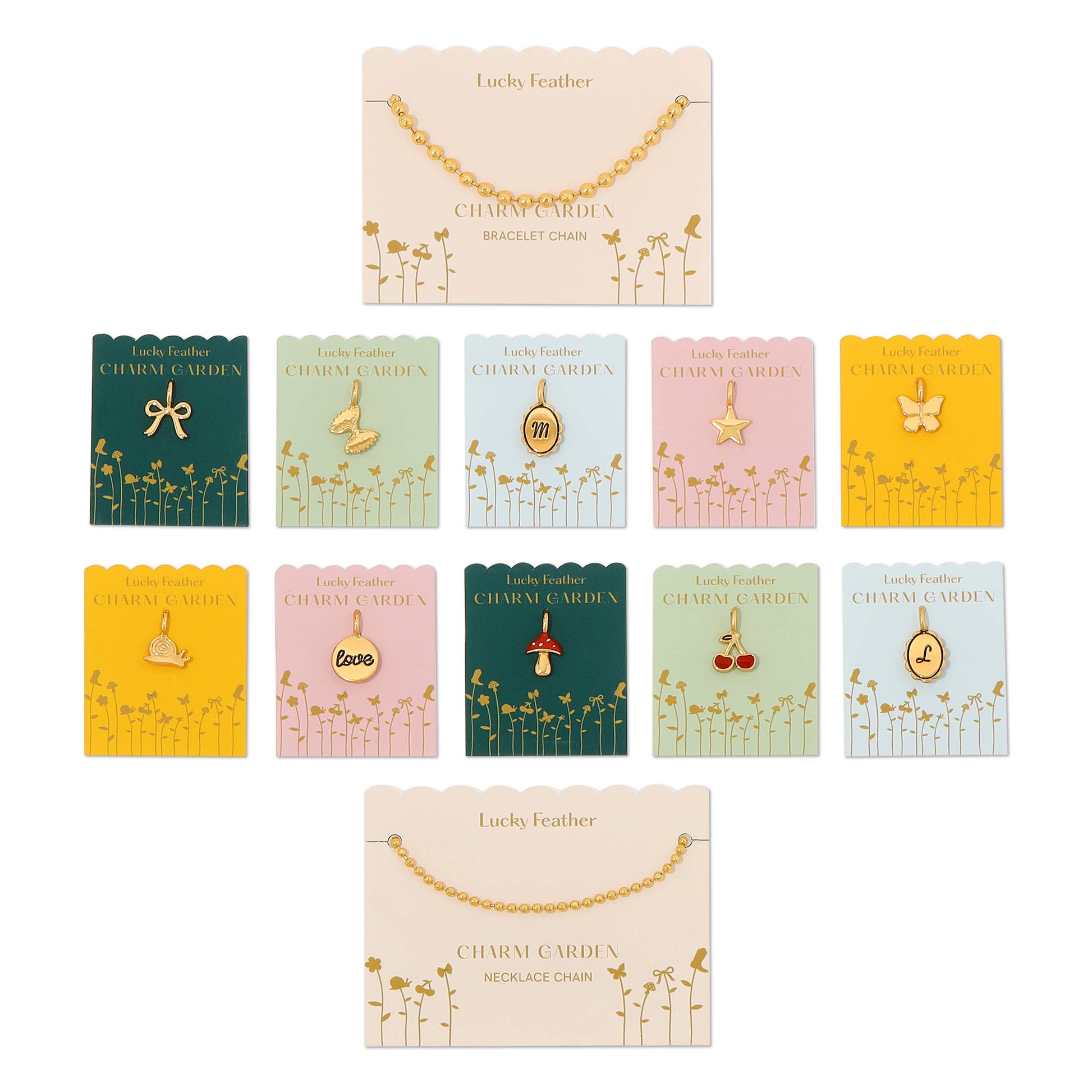A fresh take on our original Charm Builder Collection! The Charm Garden features miniature vintage-inspired shape and initial charms that can be added to beaded chain necklaces and bracelets to create your perfectly personalized jewelry bouquet. Charms and chains are dipped in 14K Gold. The chain necklace is adjustable 16-18" in length and the chain bracelet fits up to 8" wrists. Charms feature scratch-proof enamel coating.