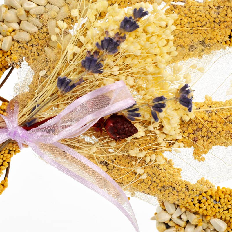 Natural grapevine wreath coated with premium bird seed, ribbon, and dried floral.