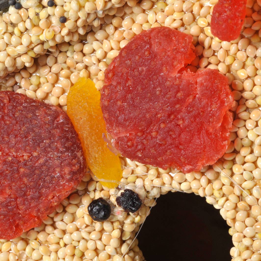 Delicious and delectable premium bird seeds coat these wooden houses and decorated them with sweet spring fruits. A delightful treat for your favorite backyard birds and a thoughtful gift for any bird-lover. Ingredients: millet, black oil sunflower, flax, canola, apricot, strawberry, kiwi, blueberry gelatin.