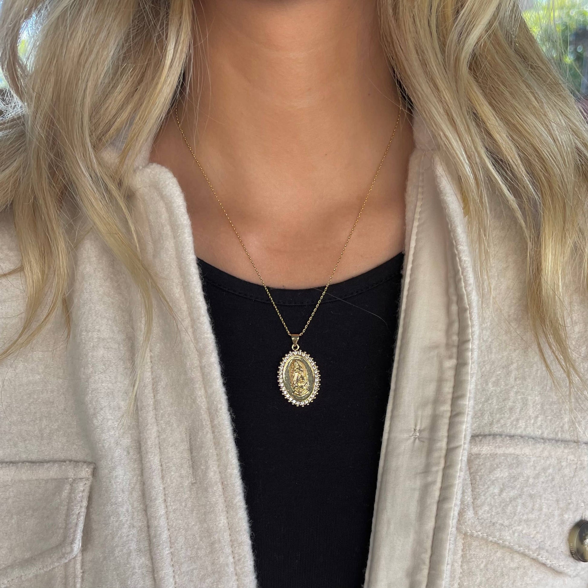 We can't get enough coin jewelry pieces-and it seems like our customers can't either! This stunning gold coin depicting the Virgin Mary hangs on a stainless steel adjustable chain that can be worn at 16", 18", or 20". Pair this beautiful necklace with a short necklace or a choker and your look will be complete. You've got to add this to your collection-it's such a perfect layering piece!