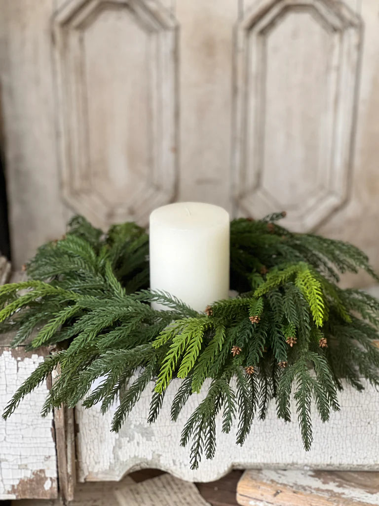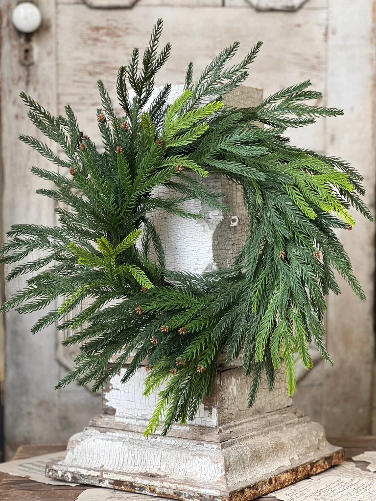 Tendrils of cascading soft touch greenery in tonal shades of green are peppered with baby pine cones. A gorgeous season spanning collection with unsurpassed styling options.