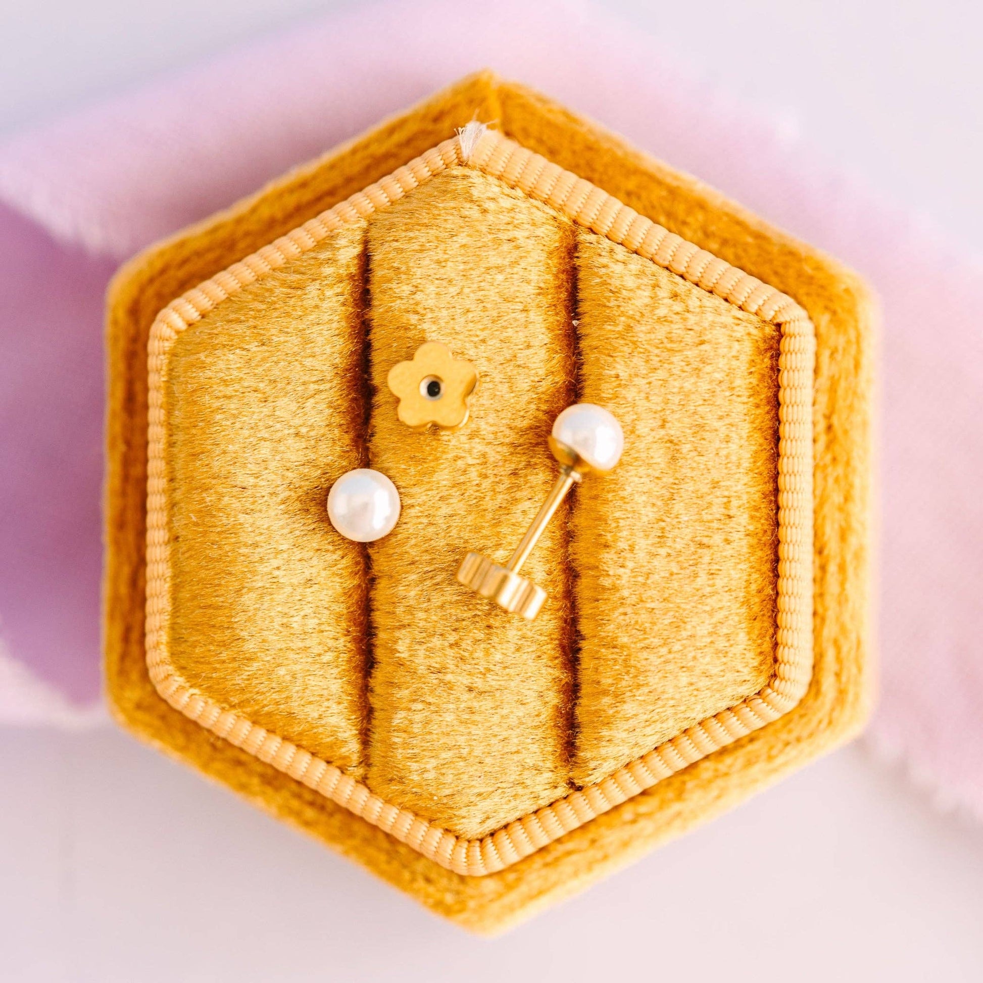 The pearl stud earrings offer a classic touch, featuring fresh water pearls beautifully paired with surgical-grade stainless steel and an 18K gold PVD coating. Always hypoallergenic and free from lead and nickel, they feature a flat screw-back and ultra-thin 0.8 mm (20 gauge) post for a secure, comfortable fit, even for smaller ears. Their design resists moisture, making them safe to wear in the bath or pool. Perfect for daily wear without worry.