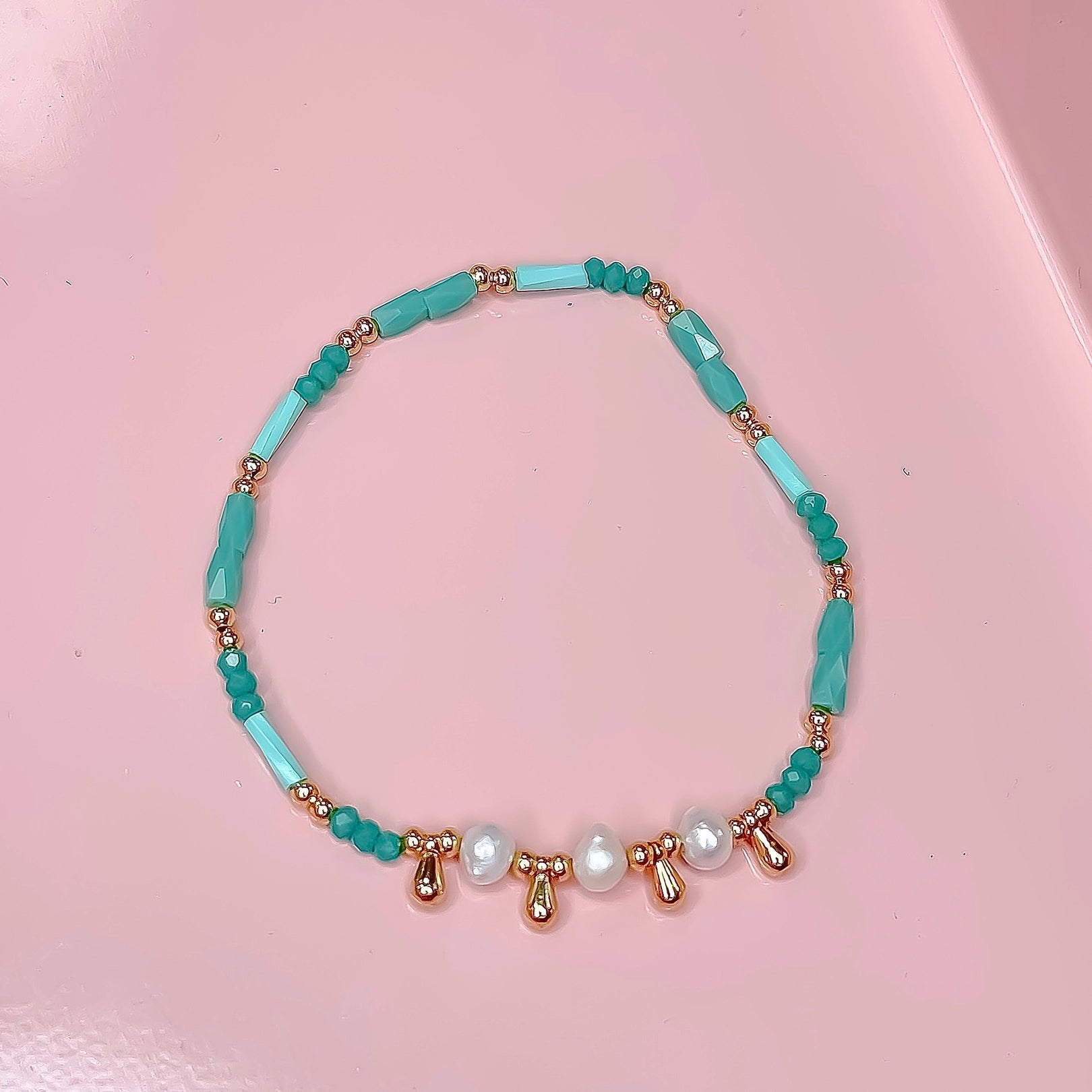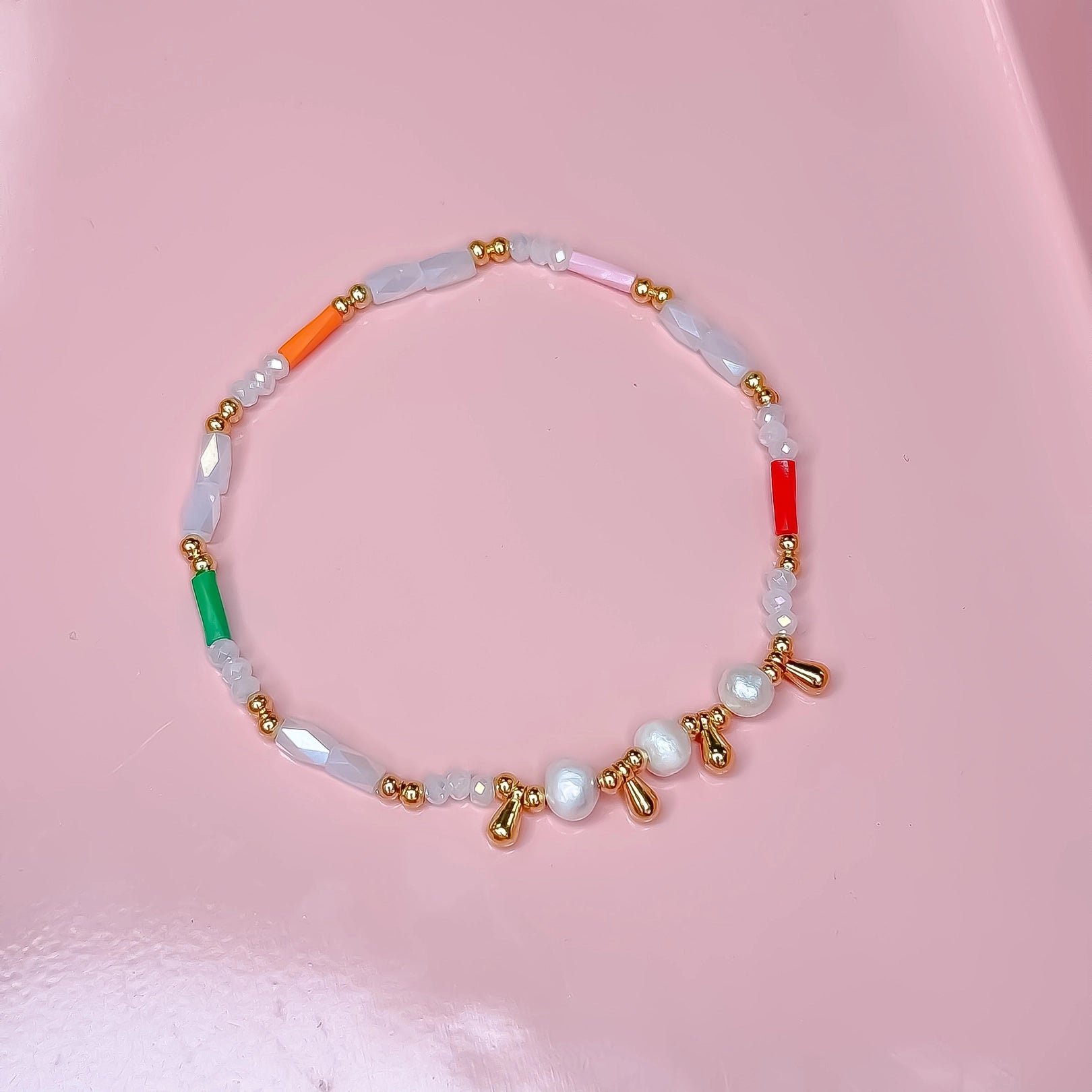 This vibrant mix of stretchy bracelets features colorful glass beads, pops of gold, and delicate pearls with mini charm drops for that extra sparkle. Stack them high or wear one for a pop either way, it's a whole vibe