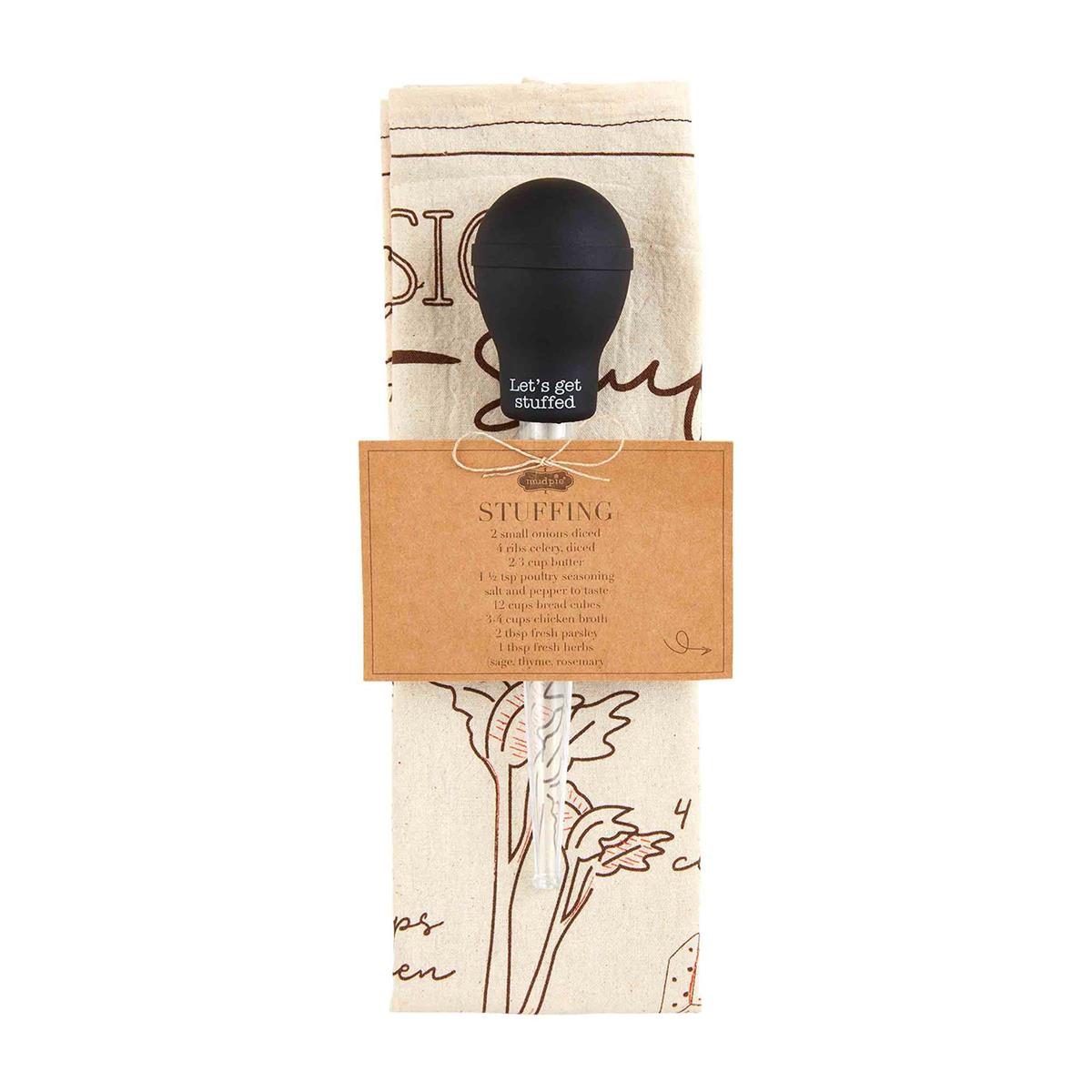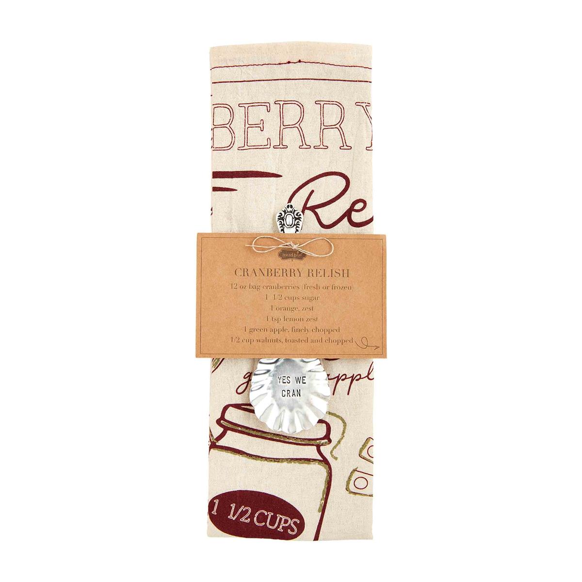 3-piece set. Cotton hand towel. Comes with wood and metal utensil and kraft recipe card.