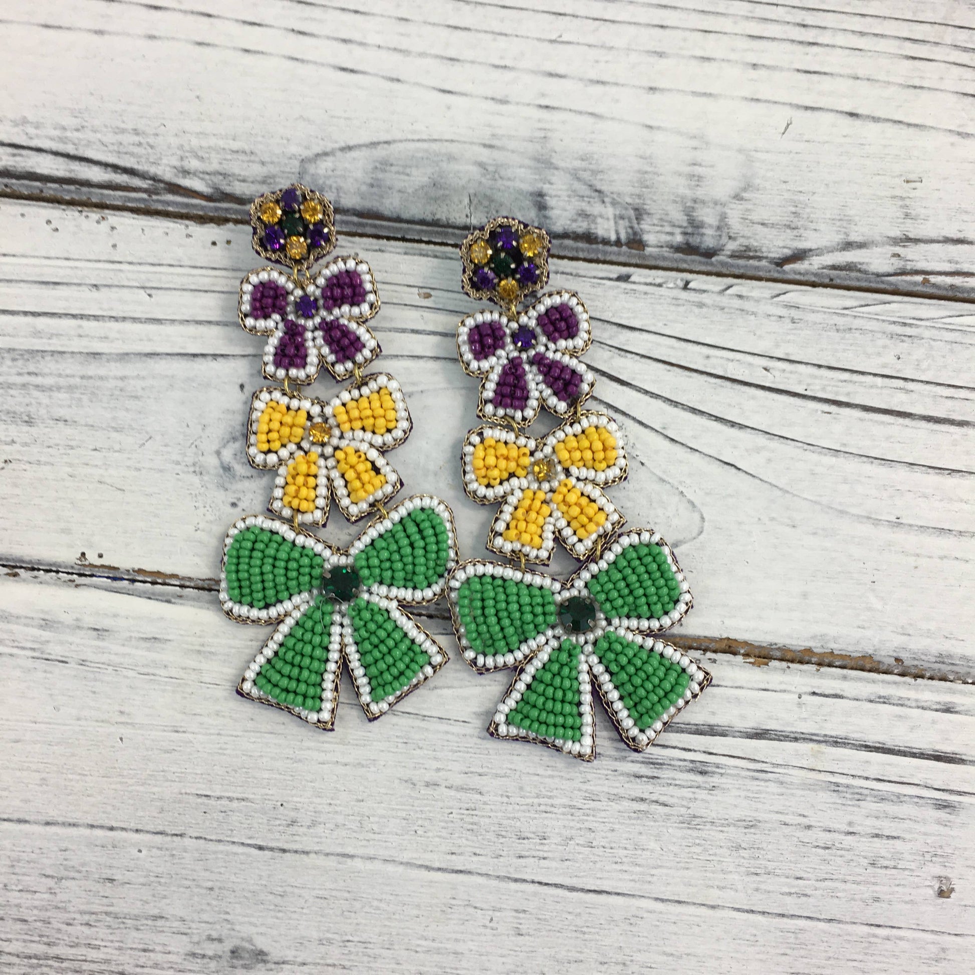 These are our gorgeous beaded Mardi Gras bow earrings! These are stacked so cutely and have adorable little rhinestoned accents!