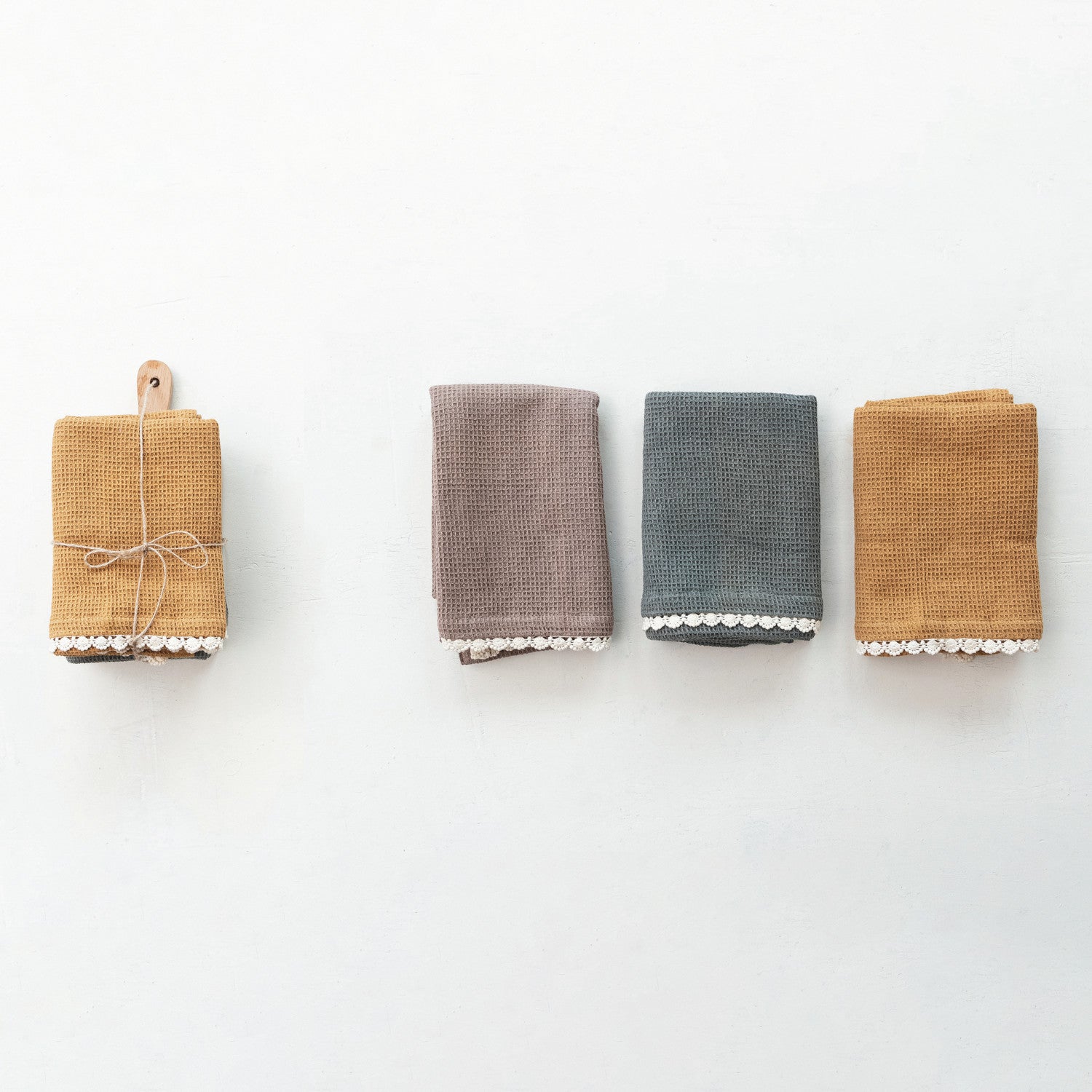 3 cotton waffle weave tea towels tied with jute rope to cheese/cutting board