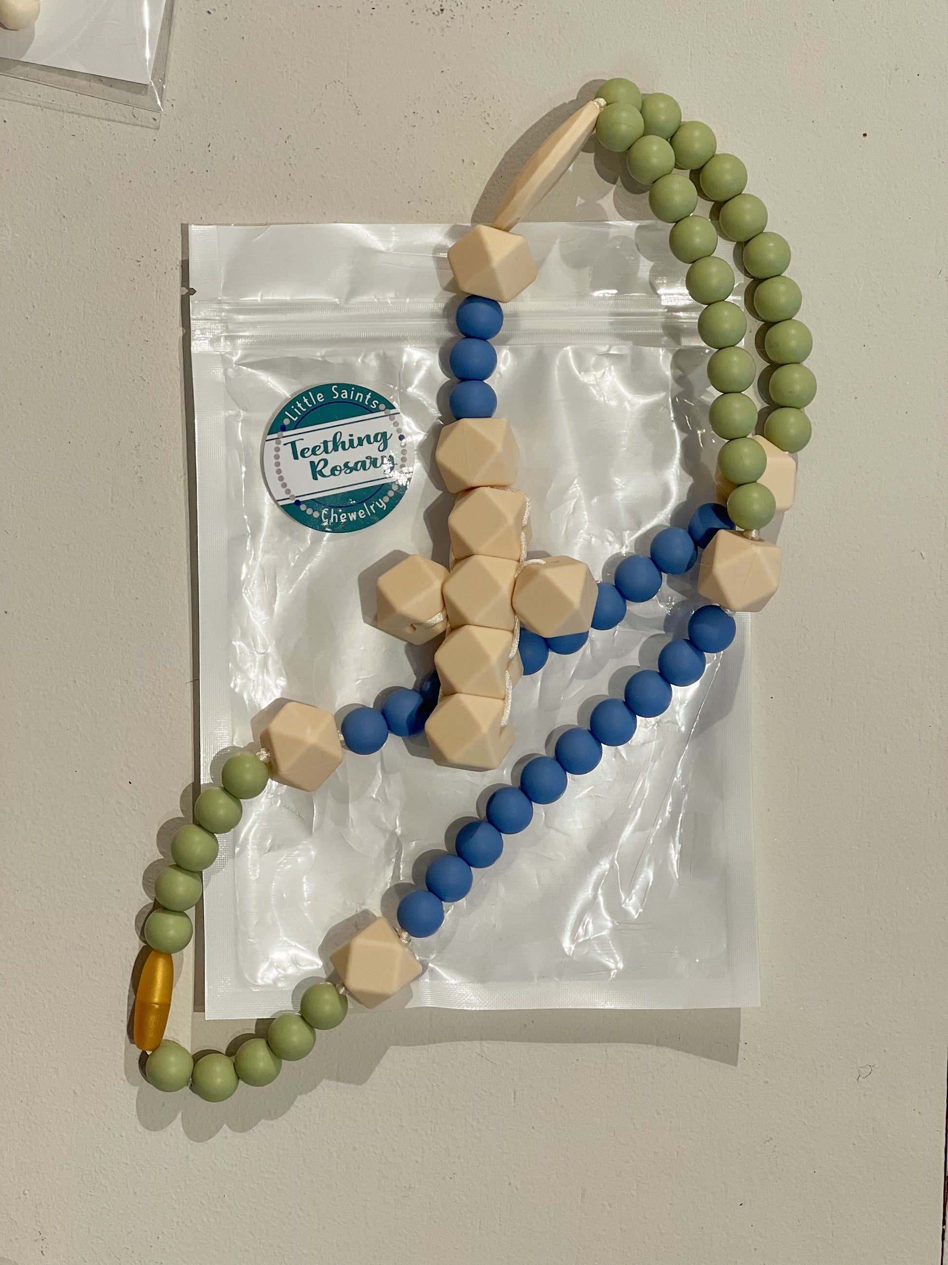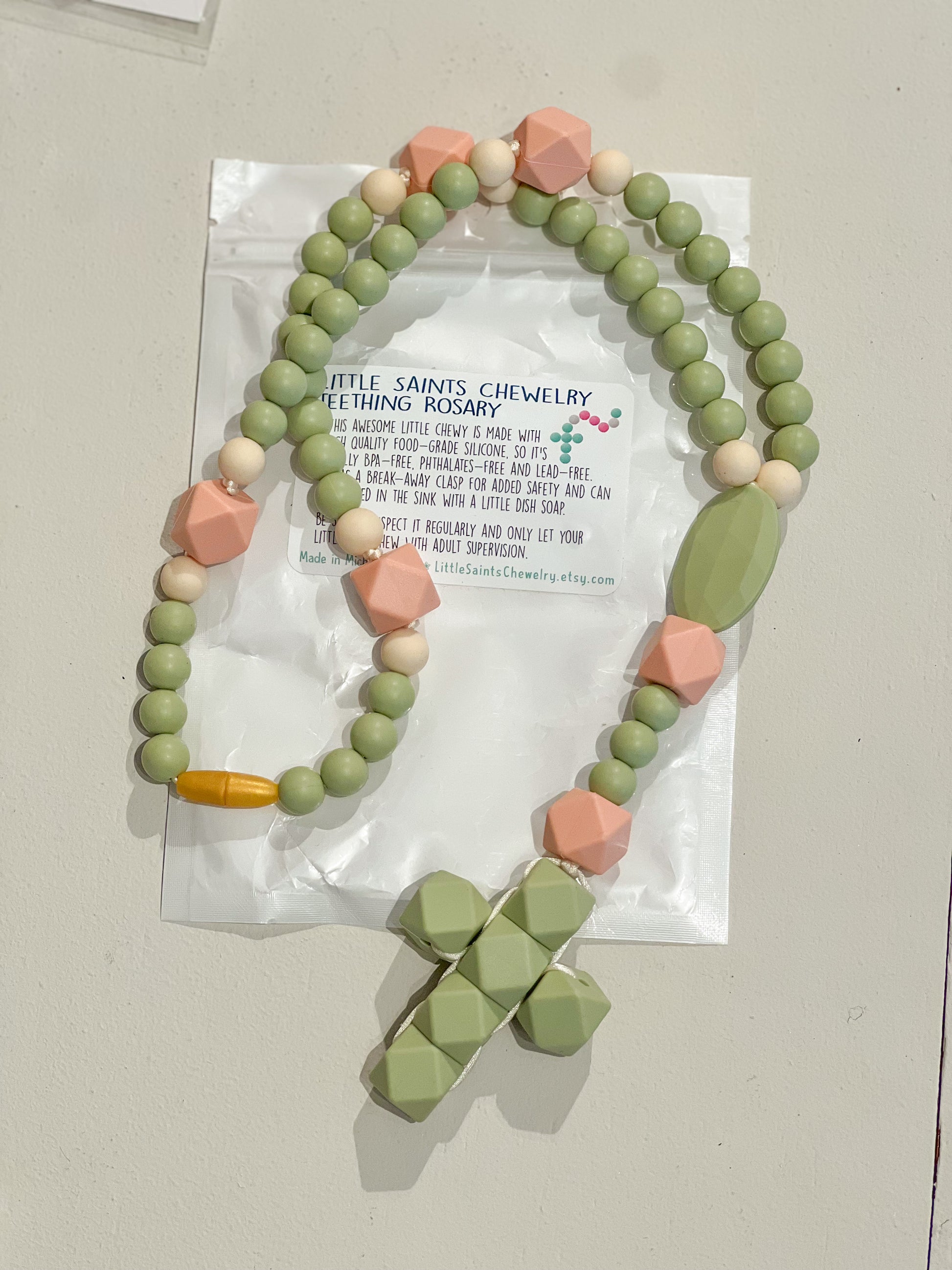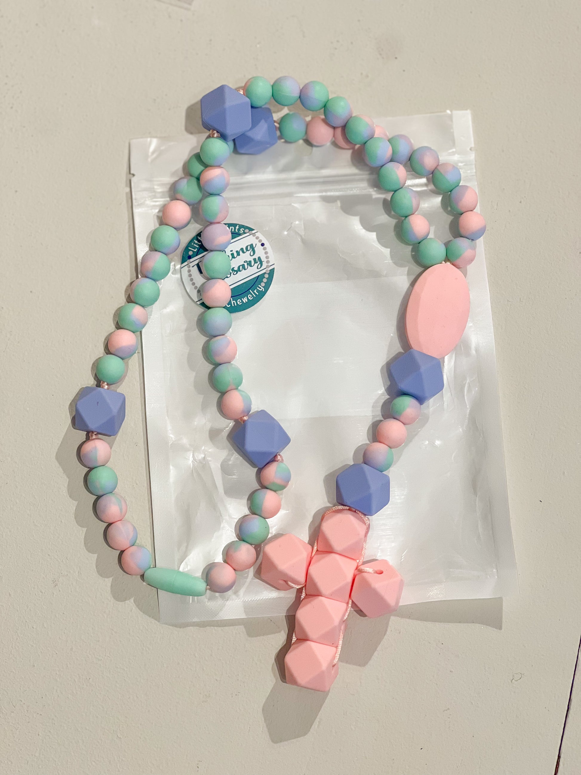 Silicone rosaries perfect for a baby shower gift, for a baptism, or birthday party gift.