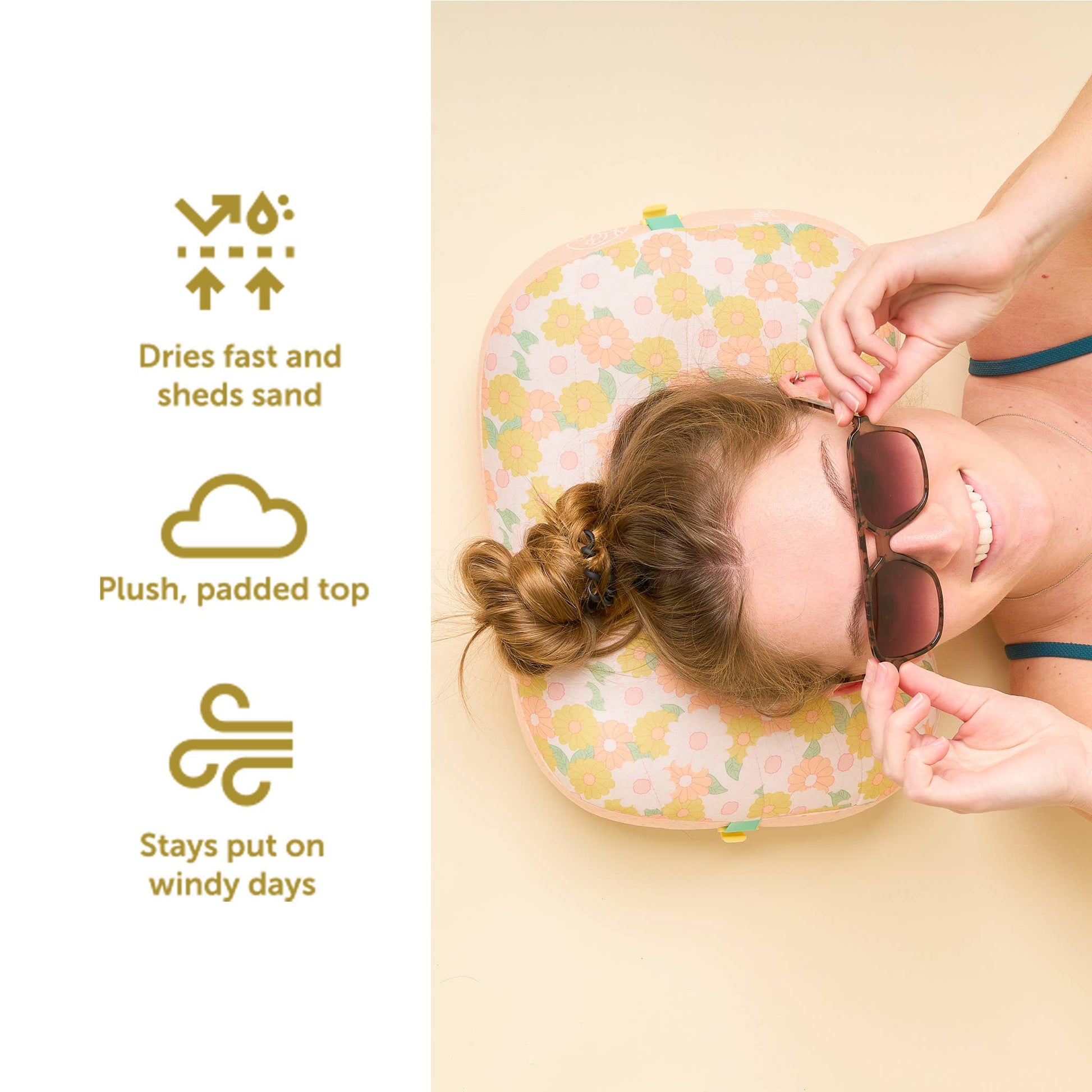 Ditch the crumpled up towel and say hello to blissful beach naps! For the beach, boat, poolside, camping Patented pocket for sand - stays put on windy days Easy to inflate Compact storage for portability Dries fast and sheds sand Plush, padded pillow top