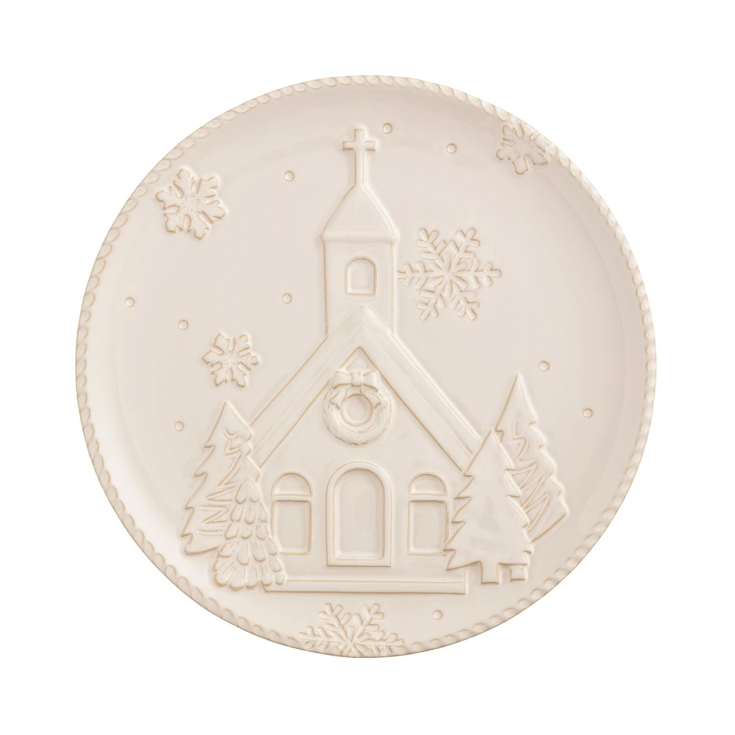 Milk glazed plate with textured relief Christmas church and snowflakes.